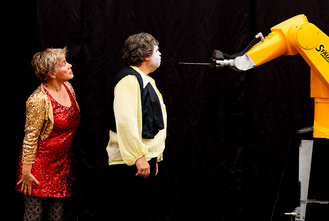 Accompagnée de Xavière, notre technicienne préférée, nous voilà rendus sur le parvis du théâtre 95, Points Commun.