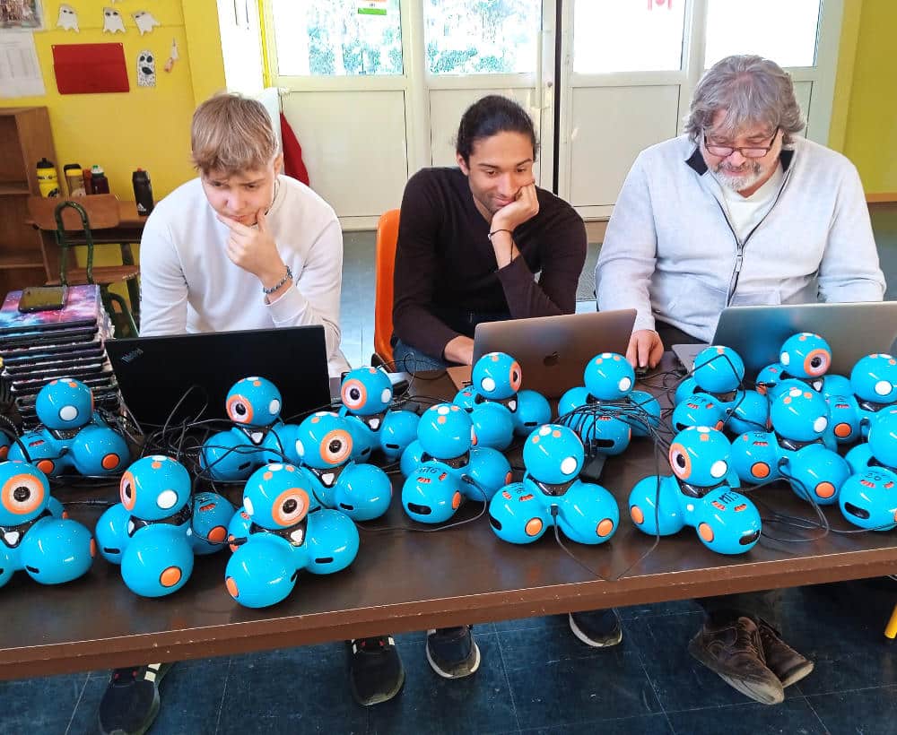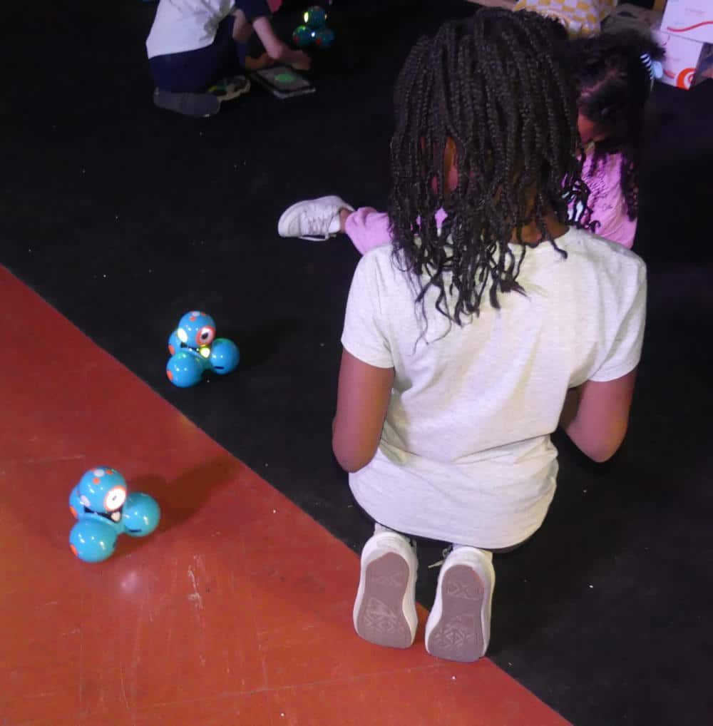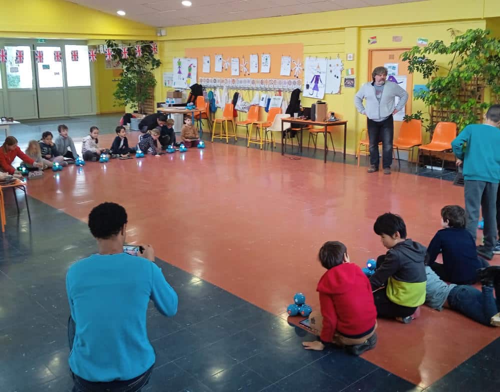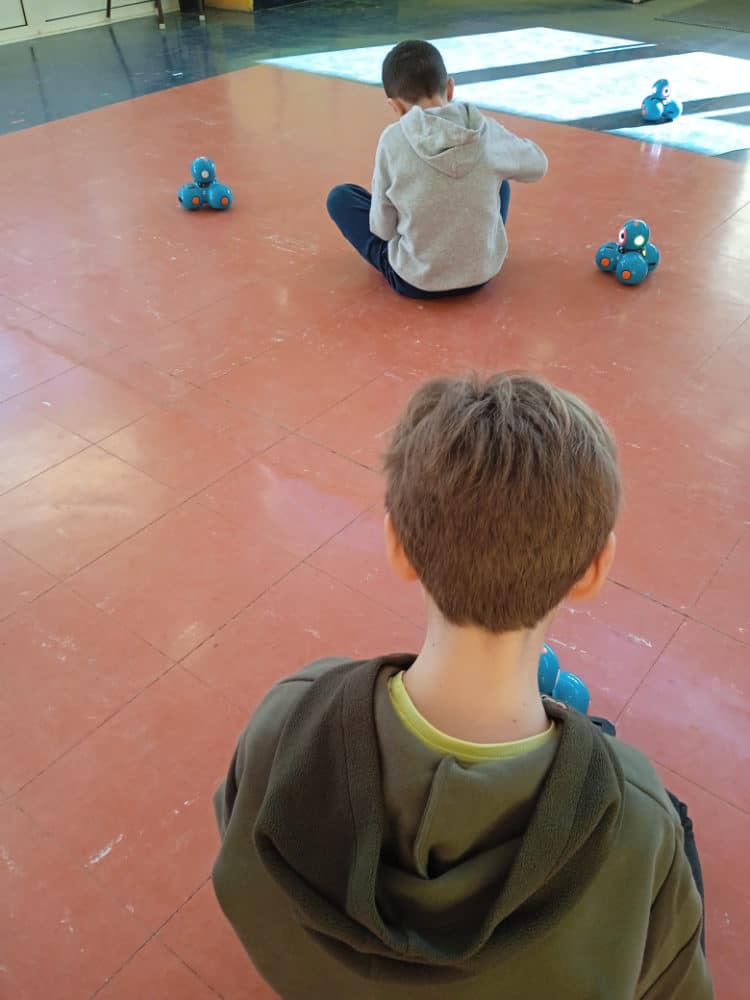 Ici on crée un programme en Scratch avec de drôles de créatures.Filles, garçons ? On ne sait pas, peu importe...Ils roulent, parlent, évitent les obstacles.Chacun imagine le parcours, l’application qu’il souhaite pour son robot.