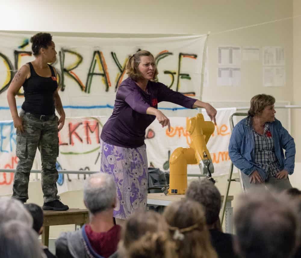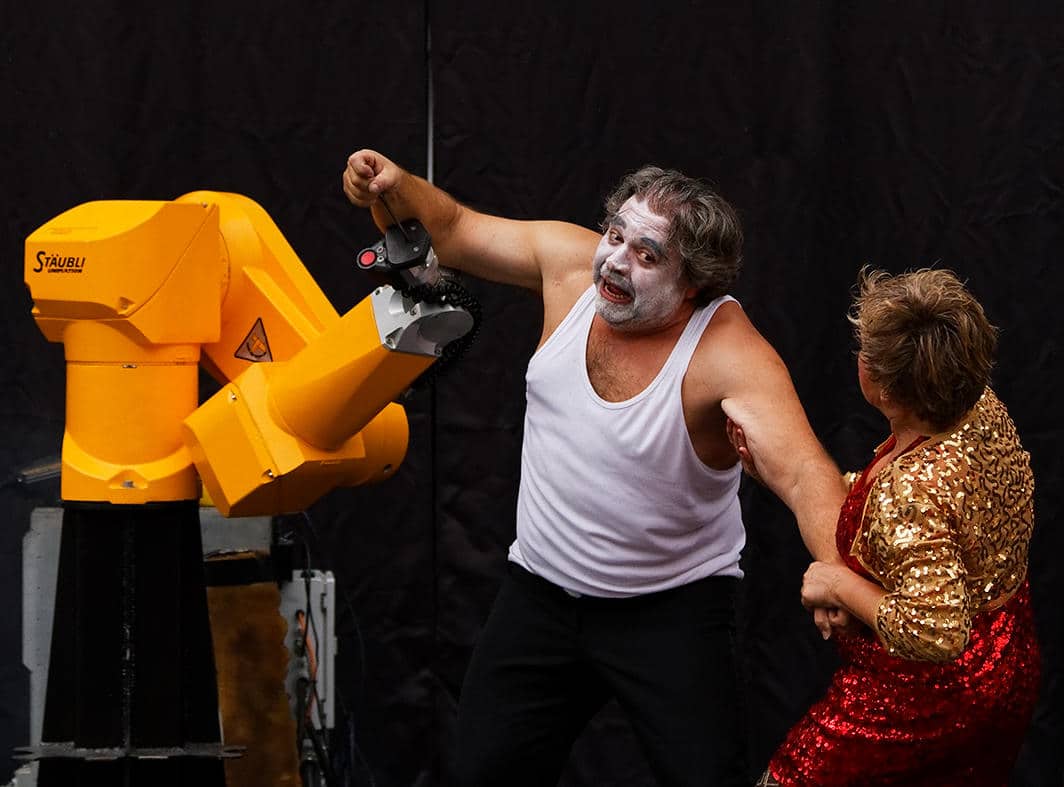 – Proposition de spectacles vivants interactifs, poétique, philosophique avec des robots industriels, transformés et programmés comme acteur.